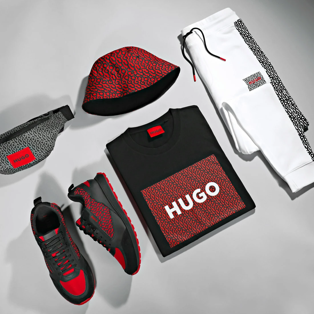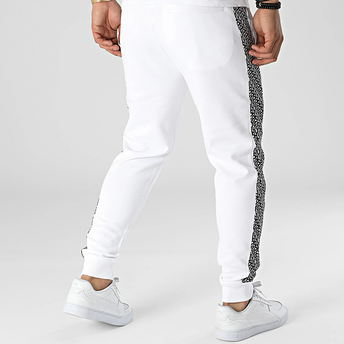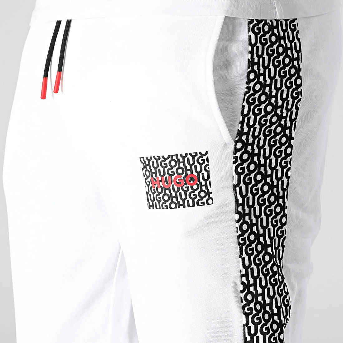 • Bandes à motif HUGO le long des jambes